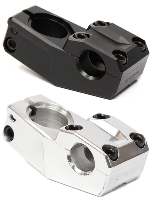 The Division Terminal stem features a topload design machined from 6066-T6 aluminum with recessed sides, machined bottom section and faceplate for weight savings, chamfered edges, solid chromoly stem bolts for increased strength, and a recessed compression bolt area.
